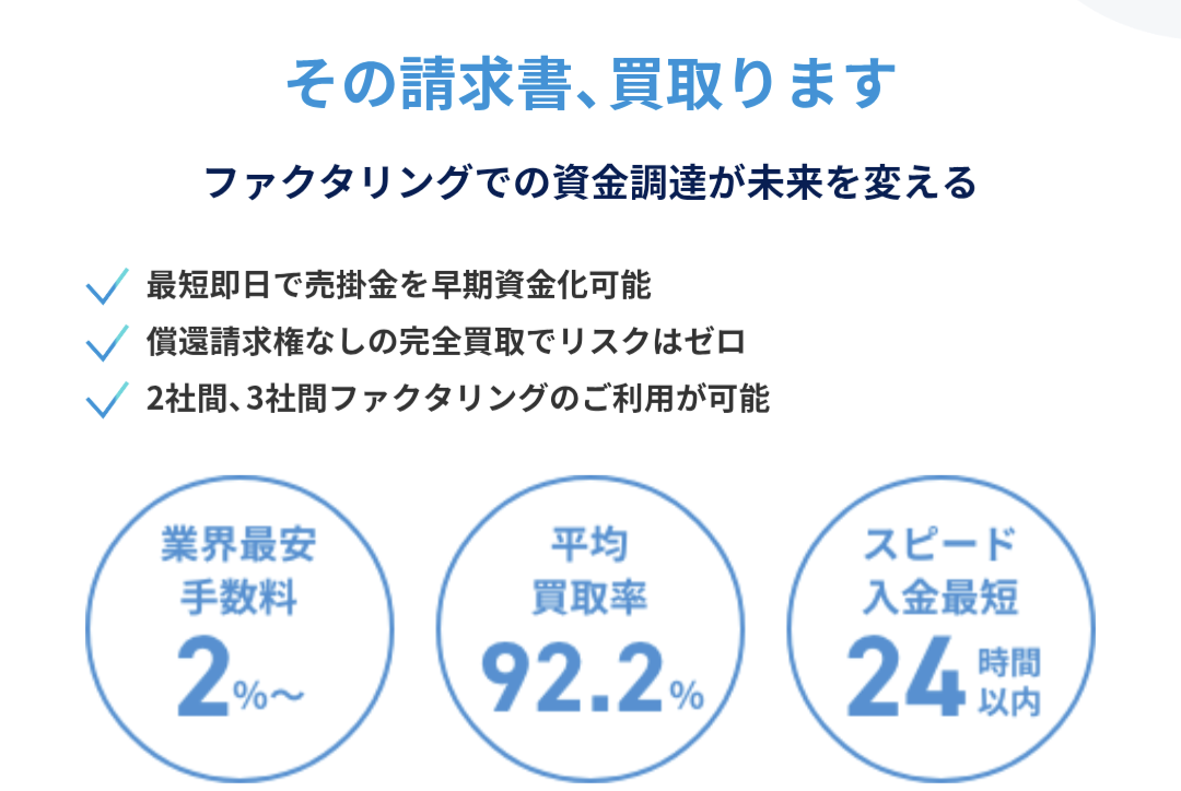 あなたの「売掛金(取引先からもらう予定のお金)」をファクタリング会社が先に買い取ってくれて即現金化してくれるサービスです